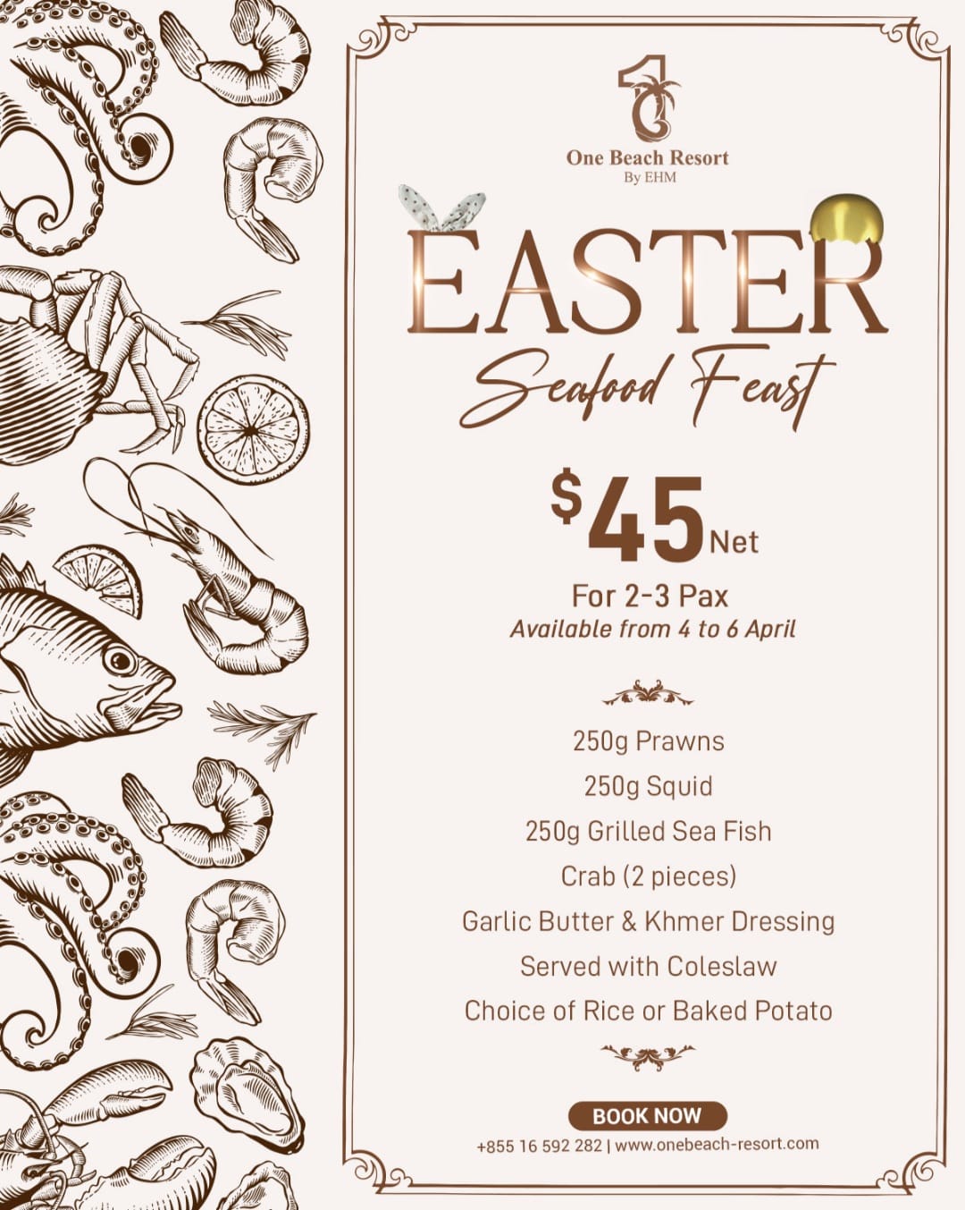 Enjoy the Easter Seafood Feast at One Beach Resort by EHM from 4th to 6th April, where fresh seafood meets stunning beach views. Gather your friends and celebrate Easter with a feast by the ocean.